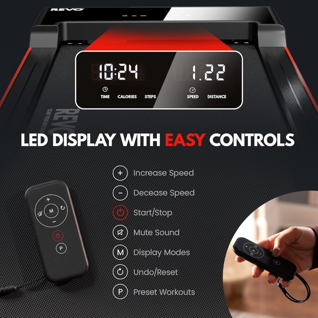Performance and Usability: With a speed range from a slow 0.5 mph up to a brisk 4 mph, the REVO is versatile enough to accommodate everything from a leisurely walk while watching TV to a quick jog to re-energize during a work break. Its lightweight build doesn’t compromise on stability, ensuring a smooth and safe exercise session. The LED dashboard and remote control enhance user experience by providing easy access to monitor and adjust your activity levels without interrupting your flow—ideal for staying active during busy days.